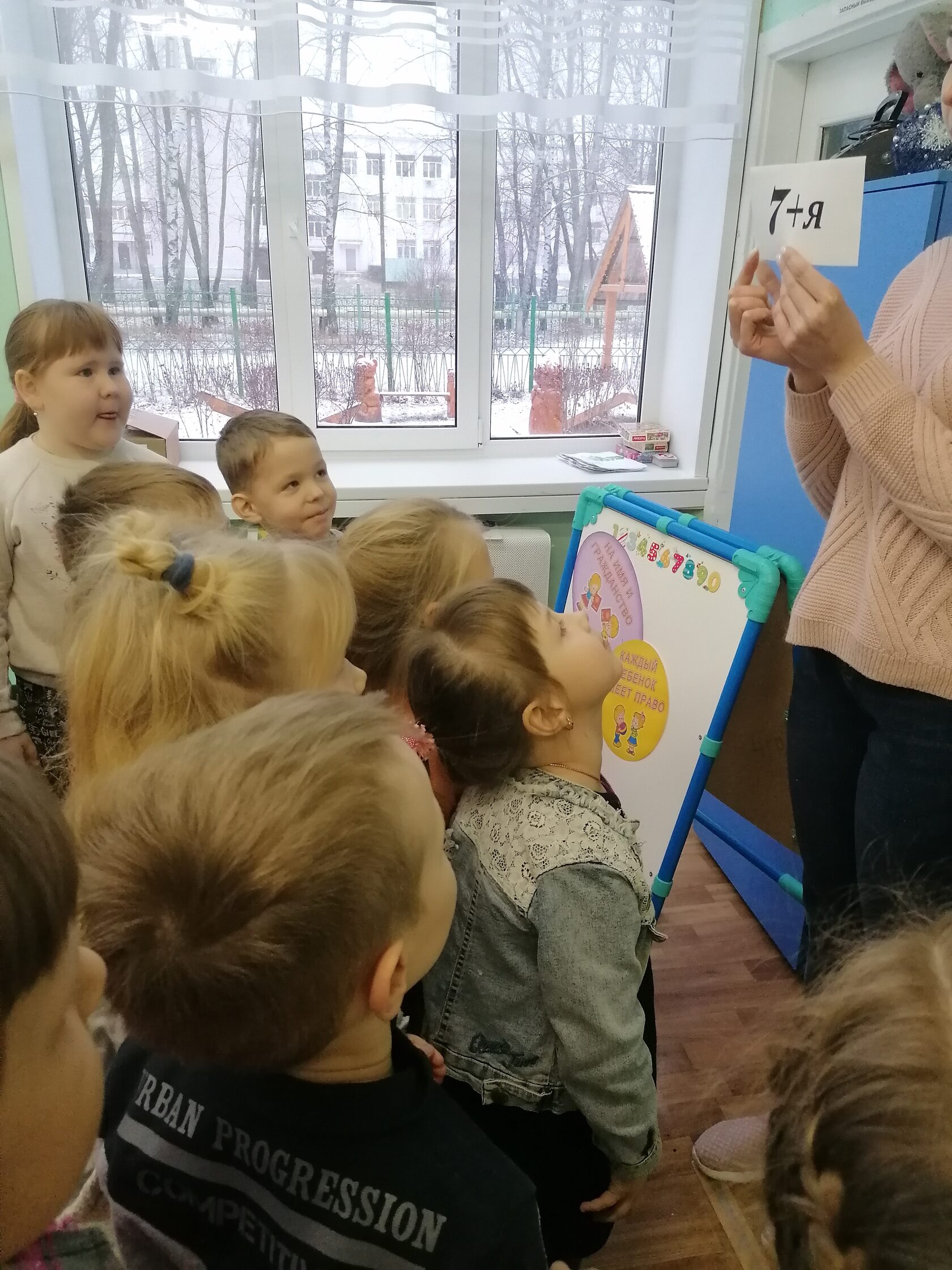 Воспитатель: Познакомится со следующим правом нам поможет сундучок, в котором лежит необычный конверт. Посмотрим, что в нём? (цифра 7, знак «+», буква я)