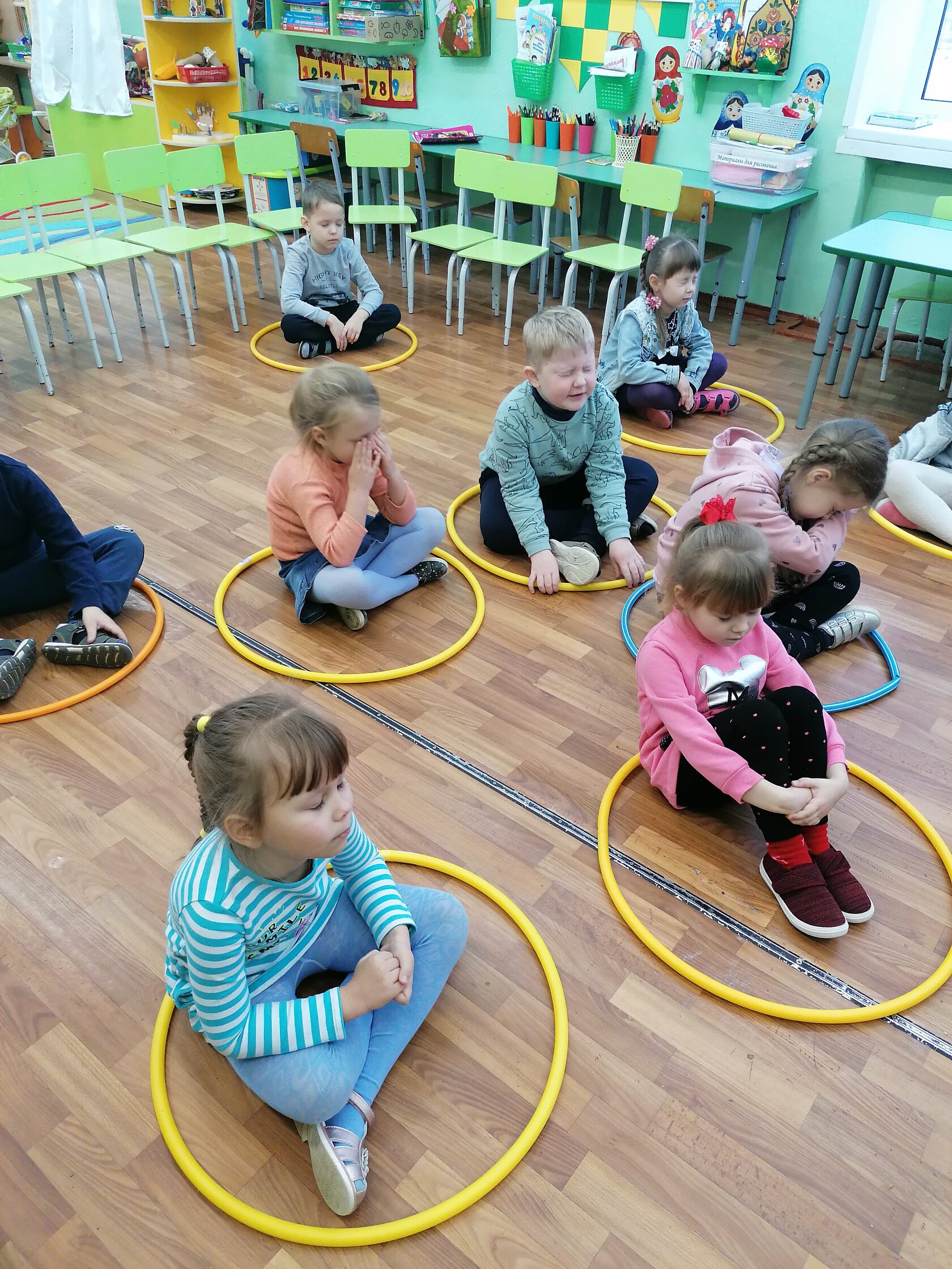 Воспитатель: Возьмите обруч и отнесите туда, где вам нравится. Это будет ваше место. Обойдите вокруг своего обруча и сядьте в обруч. У всех получилось?