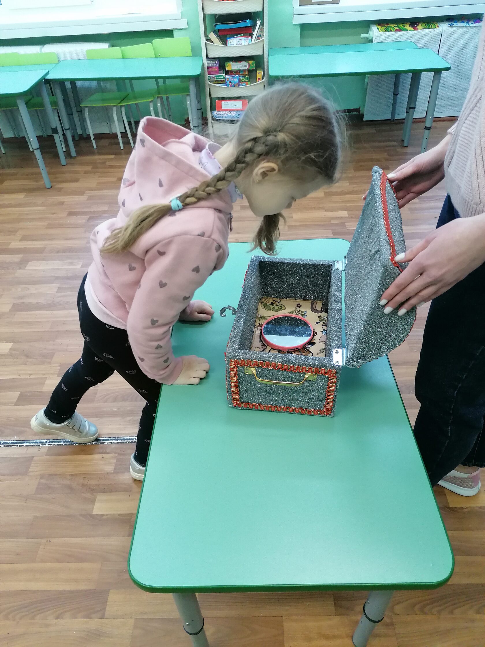 Воспитатель: Хотите заглянуть в сундучок? Но не рассказывайте кого или что вы там увидели, пока все самые смелые не заглянут на дно шкатулки (дети по очереди заглядывают в шкатулку)