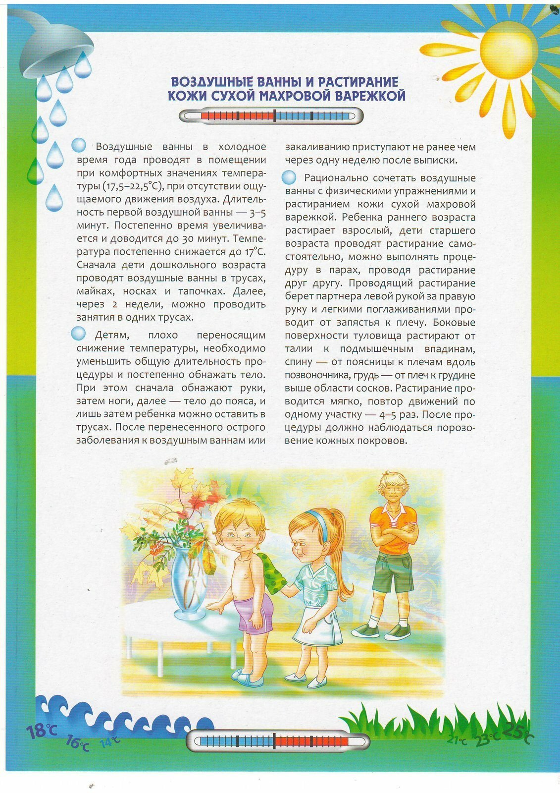 3. Влажное обтирание: проводится смоченным в воде и отжатым куском чистой фланели, один раз в день по 1-2 минуте. Начинать с рук - от пальцев к плечу, затем ноги, грудь, живот и спину до легкого покраснения. Температура воды в возрасте 3-4 года +32 С, 5-6 лет +30 С, 6-7 лет +28 С; через 3-4 дня снижают на 1 С и доводят до +22 +18 С летом и +25 +22 С зимой. По окончании ребенок должен быть тепло одет. В случае перерыва, начинают с сухих обтираний.