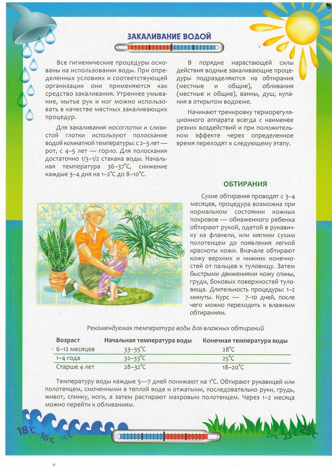 6. Общее обливание: начинать с 9-10 месяцев, голову не обливать, при этом ребенок стоит или сидит. Температура воды в возрасте до одного года +36 С, 1-3 года +34 С, старше 3 лет +33 С. Постепенно снижая на 1 С в неделю, до +28 С зимой и +22 С летом. Длительность до 1,5 минут. После растереть тело полотенцем до розового цвета.