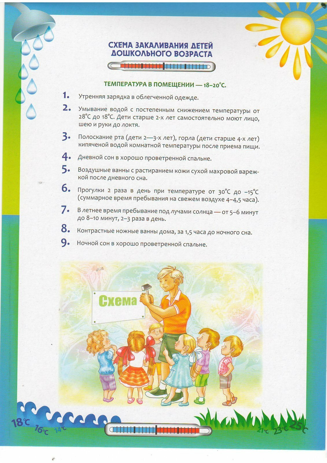Основные принципы закаливания детей дошкольного возрастаЧтобы добиться положительного эффекта необходимо соблюдать следующие схемы:- регулярность процедур (ежедневные занятия в одно и то же время);